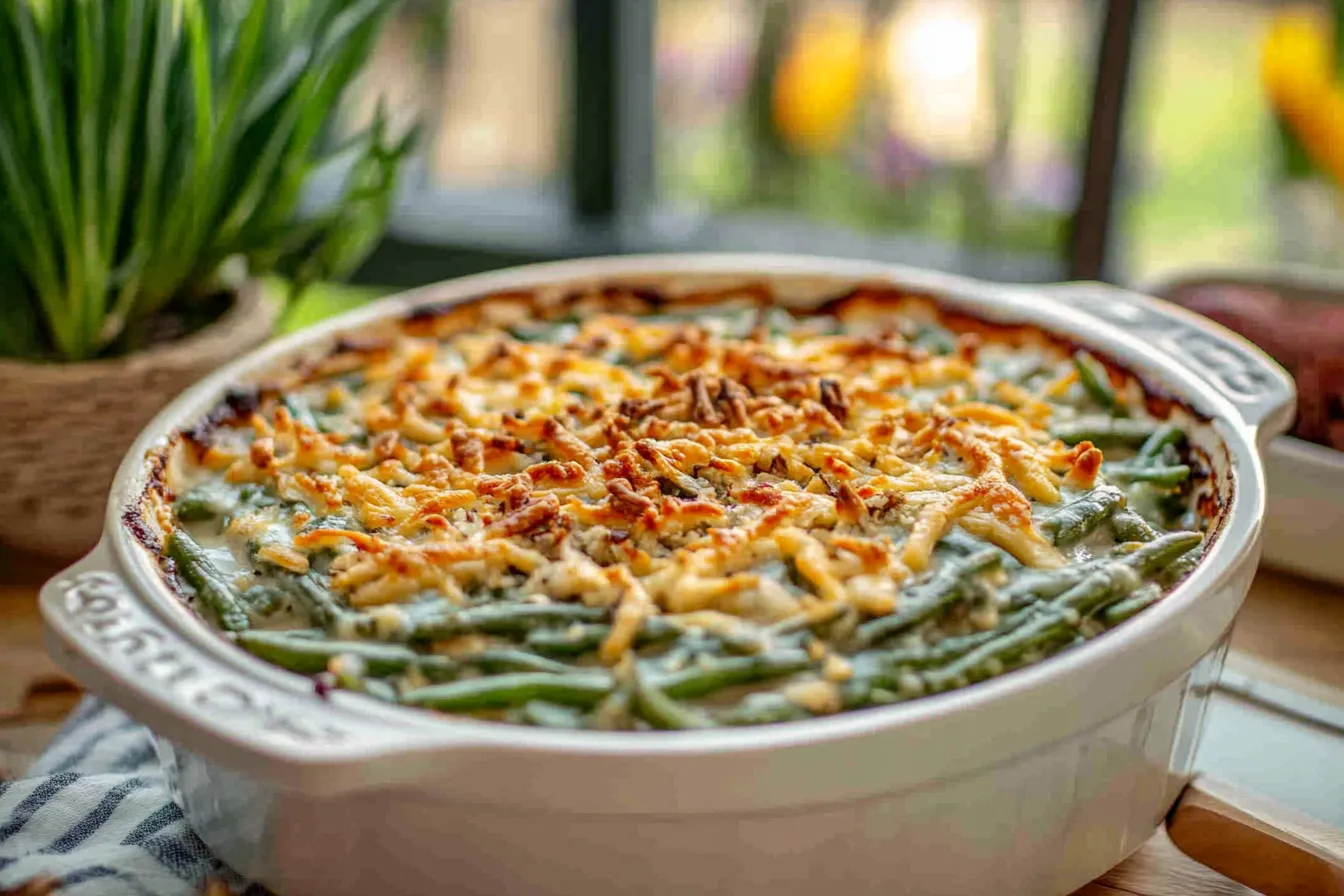 A classic creamy green bean casserole, perfect for family gatherings and holiday feasts, featuring crisp green beans in a velvety sauce.