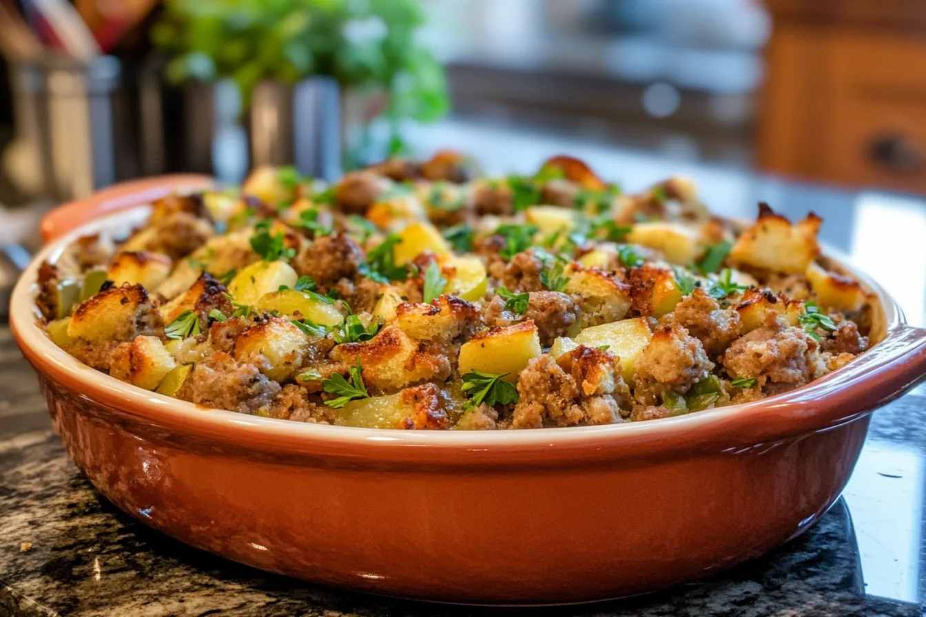 Indulge in this Savory Sausage Apple Stuffing Bake for Fall Feasts A musttry dish bursting with flavor perfect for your holiday table